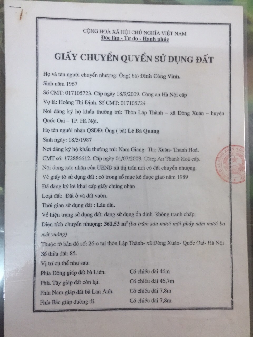 CHÍNH CHỦ CẦN CHUYỂN NHƯỢNG LÔ ĐẤT THỔ CƯ LẬP THÀNH - ĐÔNG XUÂN - QUỐC OAI- HÀ NỘI.